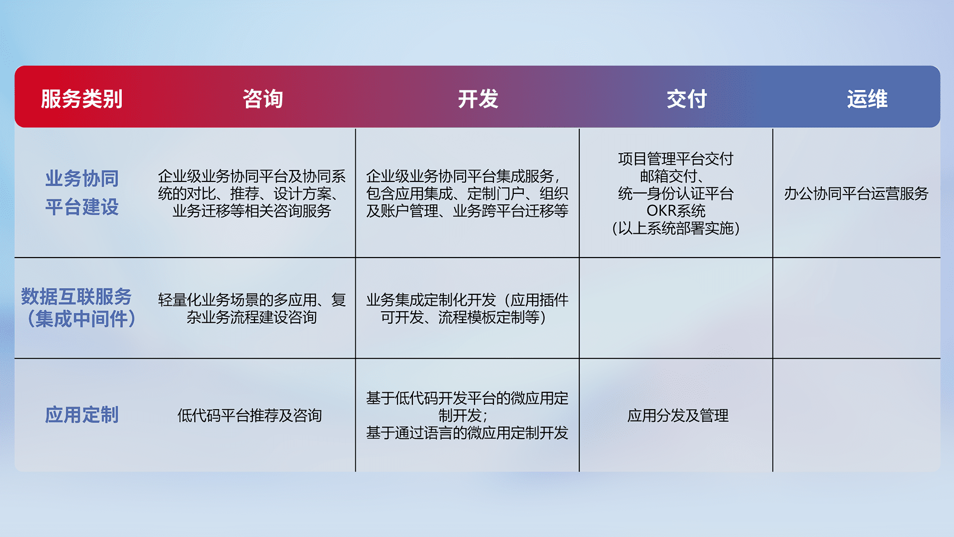 针对钉钉、、、企微、、、IDaas等平台级产品提供产品的规划、、方案、、、、交付、、、定制化开发等服务,,,,实现如统一协同办公、、、、智能客户服务、、、、混合会议管理、、、、智能数据查询、、、等业务场景,,,,实现数字化转型。。。。