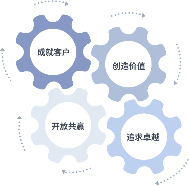 成就客户是一切决策的出发点,,,创造价值是衡量所有工作的标准,,,追求卓越是我们做事做人的态度,,开放共赢是我们的格局也是最终的结果。。价值观的齿轮环环相扣,,推动着组织里的每个人不断向前。。