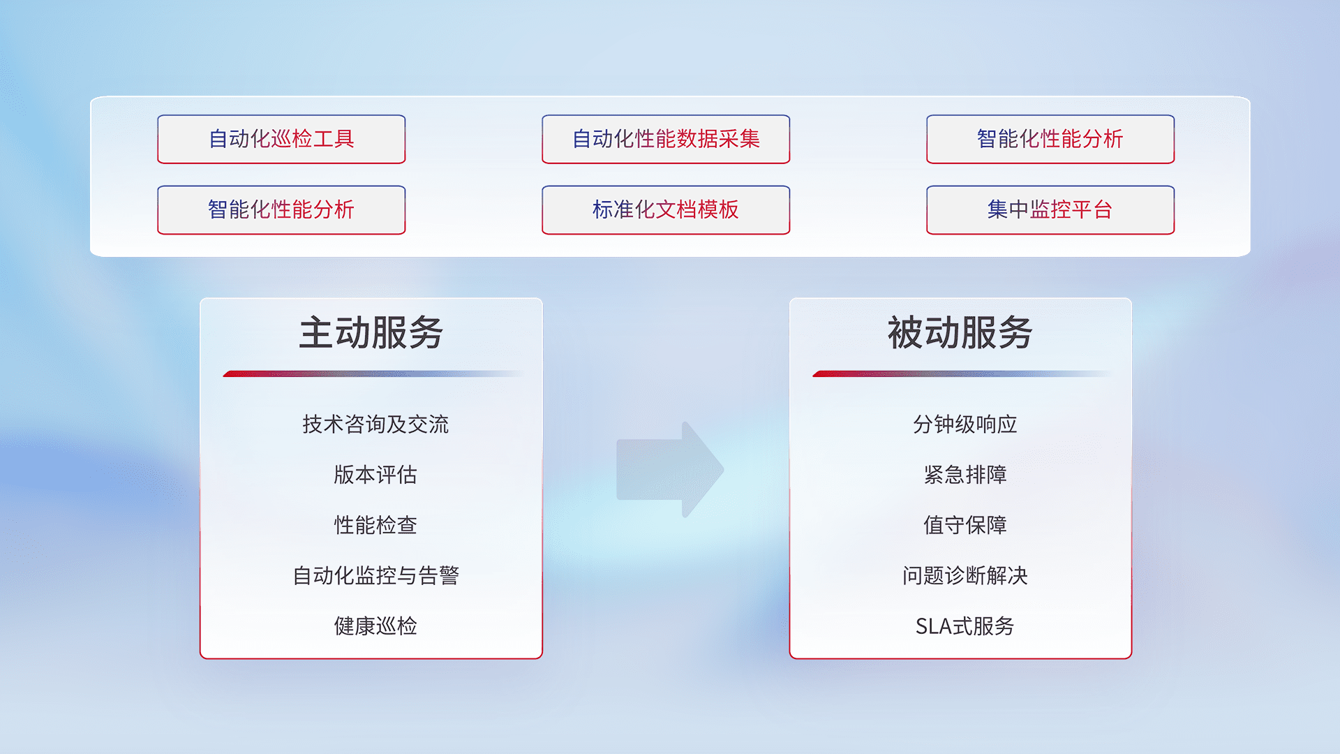 智能化工具和标准化文档,,保障服务质量,,,,提供主动服务(包含技术咨询、、版本评估、、性能检查、、、、自动化监控与告警、、、、健康巡检)和被动服务包含(分钟级响应、、紧急排障、、值守保障、、、问题诊断解决、、、SLA服务)。。。。